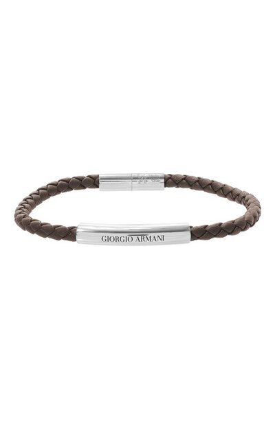 Для изготовления узкого темно-коричневого браслета использовали прочную воловью кожу, узкие полосы которой переплели вручную. Блеск аксессуару добавляет трубчатая вставка с выгравированным логотипом, выполненная из полированного стерлингового серебра 925 пробы. Из такого же металла произвели крупный магнитный замок.