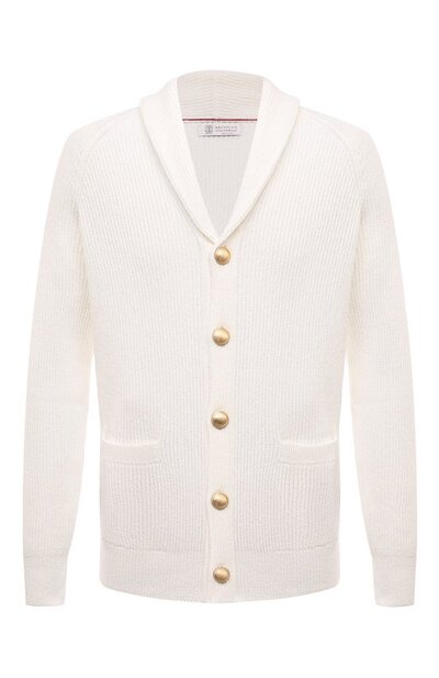 Для создания кардигана с шалевыми лацканами и боковыми карманами выбрали мягкий фасонный хлопок. Немного грубоватая на вид пряжа придает еще большую фактурность английской резинке, делающей модель одновременно легкой и эластичной. В образе белое изделие с крупными золотистыми пуговицами подружится с брюками, рубашкой и кедами.