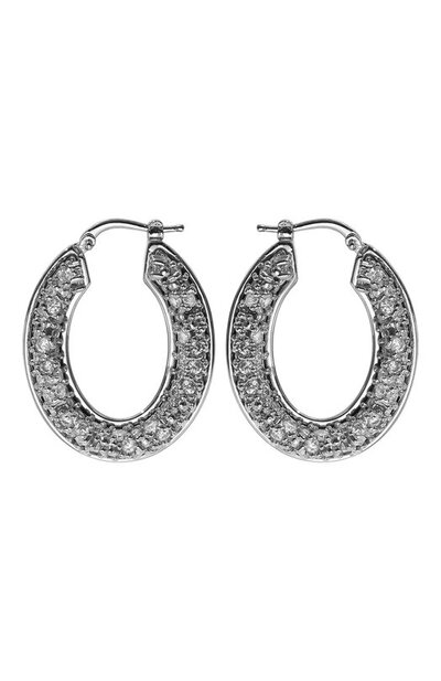 Основание овальных серег больше выполняет роль рамки, в которую вставили сверкающие фианиты. Внутреннюю часть изделия отшлифовали до идеальной гладкости. Для создания украшения использовали ювелирный сплав с гальваническим покрытием серебром.