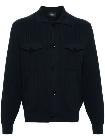 navy blue cotton blend knitted construction ribbed trim spread collar front button fastening long sleeves two chest flap pockets two side welt pockets straight hem