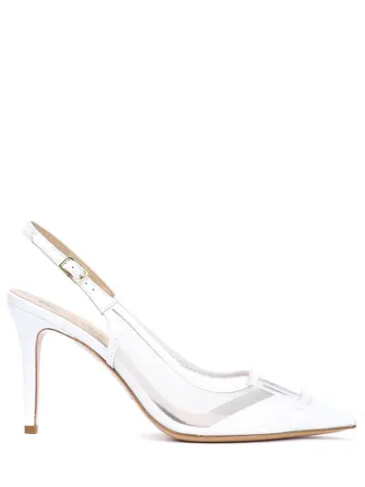 -Белые туфли из прозрачной сетки с отделкой натуральной кожей от FABIO RUSCONI. -Модель с заостренным мысом, прямоугольной пряжкой спереди, открытой пяткой, кожаной подошвой и стелькой, каблуком-шпилькой, ремешками с пряжками вокруг щиколоток.