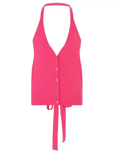-Розовый трикотажный топ из хлопка от LORENA ANTONIAZZI. -Модель полуприлегающего силуэта с бретелью-халтер, глубоким вырезом декольте, открытой спиной, застежкой на пуговицы, поясом с завязками сзади.