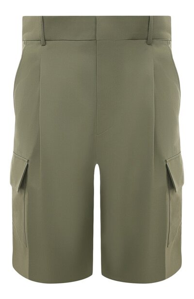 В дизайне свободных шортов оттенка хаки органично сочетали классический крой и стиль милитари. Модель со складками спереди дополнили двумя крупными накладными карманами карго по бокам. Для пошива изделия использовали тонкий полушерстяной габардин, не деформирующийся со временем.