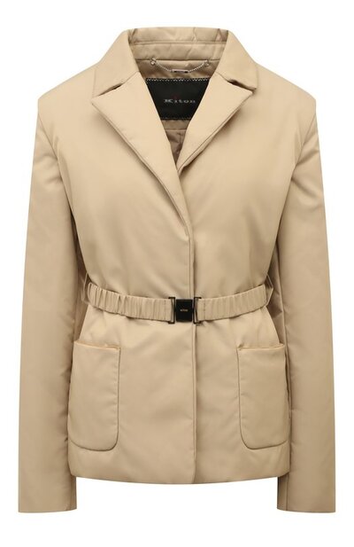 Крой для бежевой куртки одолжили у жакета с широкими лацканами и парой накладных карманов. Для пошива утепленной модели с четкой линией плеч использовали прочный нейлон, защищающий от ветра и небольшого дождя. Рукава отстегиваются, превращая изделие в жилет. В комплекте — эластичный пояс с брендированной металлической пряжкой фастекс.