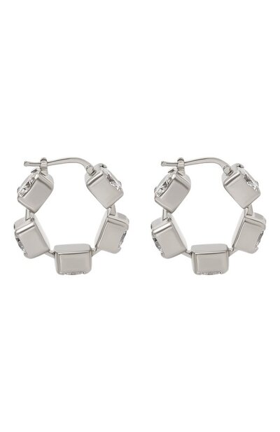 Серьги с застежкой-булавкой выполнили в виде соединенных между собой прямоугольных деталей, которые изготовили из отполированного ювелирного сплава, покрытого тонким слоем серебра с помощью гальванического метода. На каждом элементе закрепили крупный ограненный кристалл кубического циркония, деликатно мерцающего в лучах света.