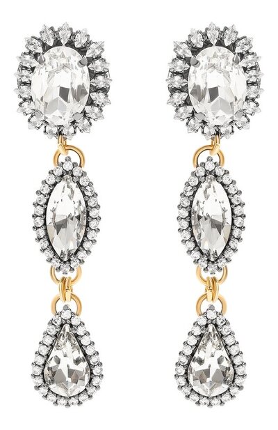 Серебристые длинные серьги из ювелирного сплава органично впишутся в образ для светского мероприятия. Аксессуар с овальным основанием и двумя фигурными подвесками декорировали прозрачными крупными кристаллами, обрамленными паве из миниатюрных стразов. Цветовой контраст украшению добавили круглые крепления с золотистым покрытием.