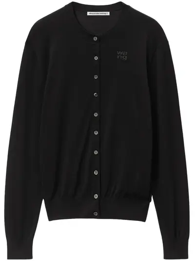 black merino wool ribbed-knit edge embossed logo to the front crew neck front button fastening long sleeves straight hem