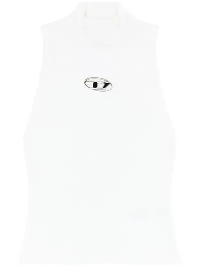 optical white ribbed knit silver-tone logo plaque high neck sleeveless straight hem