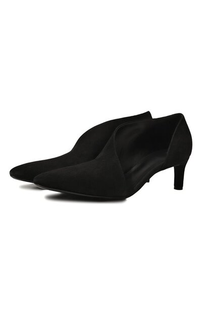 Для изготовления черных туфель с зауженным мысом и асимметричным вырезом сбоку использовали мягкую бархатистую замшу. Материал искусно выделали вручную, чтобы сделать эластичнее, поэтому модель плотно облегает стопу и сидит, как влитая. Каблук kitten heel делает пару элегантной и при этом комфортной, как балетки.