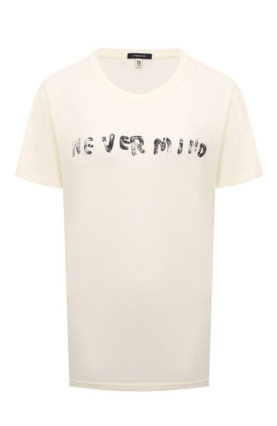 Свободную футболку оттенка ванильного крема сшили из японского хлопкового джерси, которое идеально пропускает воздух и почти не ощущается на коже. На передней панели вручную отпечатали надпись Never Mind (каждый такой принт уникален). Наши стилисты включили модель в многослойный образ с клетчатой рубашкой и джинсовыми вещами: светло-зеленой юбкой, синими ботильонами на высокой шпильке и курткой.