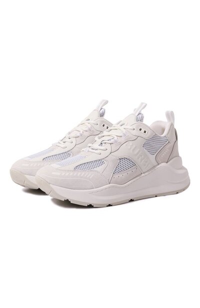 Белые кроссовки из дышащего сетчатого текстиля укрепили деталями из гладкой кожи, бархатистой замши и прочного полимера. По бокам модель украсили фактурным логотипом, зарифмованным с монограммой TB из инициалов Томаса Берберри на заднике. Пару установили на скульптурную амортизирующую подошву с протектором, обеспечивающую комфорт каждого шага.