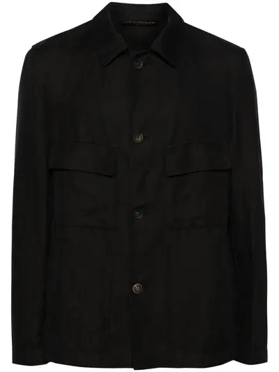 black cotton-ramie blend gabardine weave notched collar front button fastening long sleeves with buttoned cuffs chest flap pockets two side slit pockets straight hem