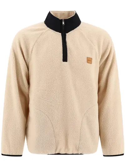 beige fleece texture contrasting trim appliqué logo stand-up collar half front zip fastening long sleeves two side pouch pockets straight hem