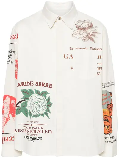 beige cotton poplin texture logo-engraved buttons logo print to the front all-over graphic print slogan print tonal stitching chest patch pocket classic collar long sleeves drop shoulder press-stud fastening cuffs concealed front press-stud fastening