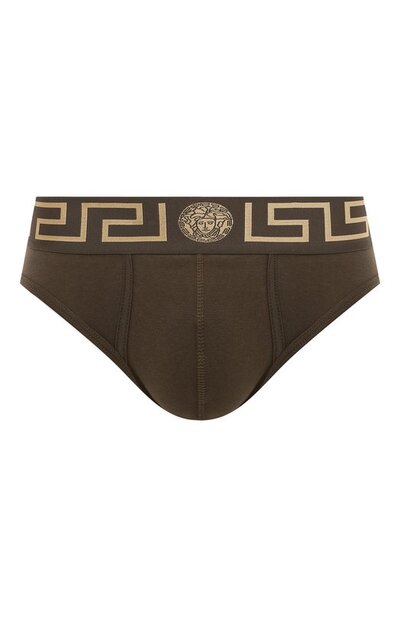 Брифы оттенка хаки выполнили из эластичного трикотажа, который произвели из органического хлопка, сертифицированного по стандарту GOTS. Модель с плоскими швами легко тянется во все стороны и приятно ощущается на коже. Трусы дополнили широким поясом с символичным меандровым узором Greca и мотивом Medusa в центре.