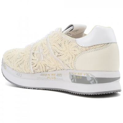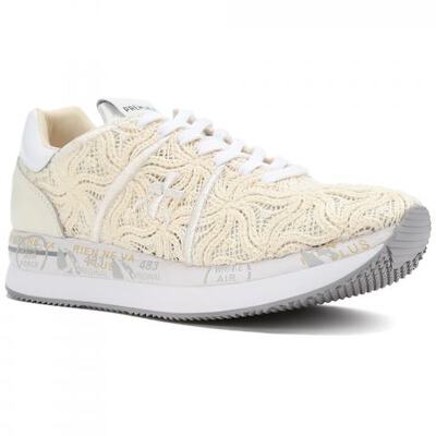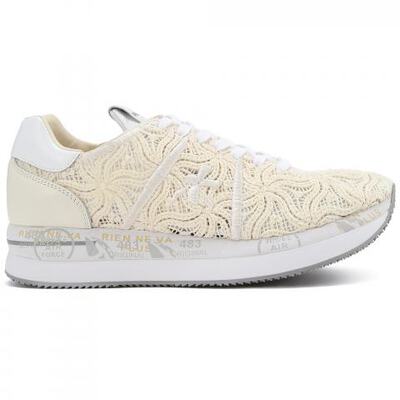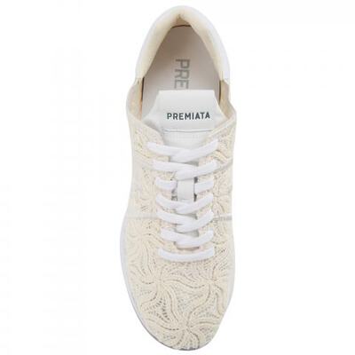 Бежевые кроссовки с текстильным верхом от Premiata. Кроссовки с кружевным верхом поддержат романтическое настроение образа, при этом станут комфортным вариантом на теплую погоду. Модель выполнена из текстильного кружева, с вставками из кожи на пятке и заднике. Внутри кожаная стелька. Подошва, украшенная фирменным принтом, выполнена из резины. Завершает дизайн нашивка в виде логотипа бренда. Такая пара будет сочетаться не только с шортами, но и с платьями, создавая объемный акцент.