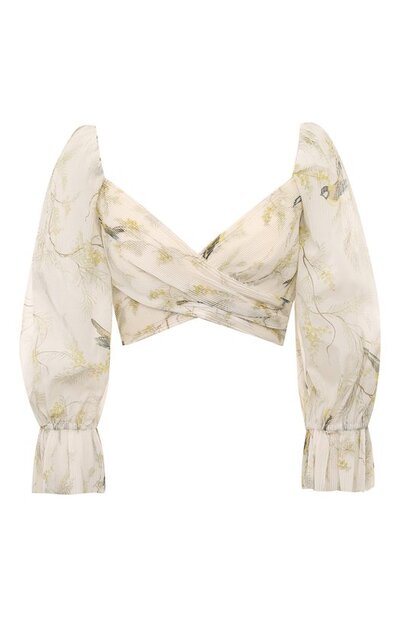 Никки Циммерманн выбрала для пошива укороченного топа кремового оттенка легкую плиссированную органзу с растительным принтом, дополненным изображением птиц. Фактура материала сделала более выразительным запах спереди и придал рукавам 3/4 объем. Модель с расклешенными манжетами и глубоким вырезом на спинке, повторяющим форму декольте, застегивается на молнию.