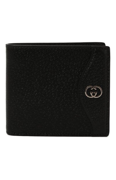 Черное складное портмоне выполнили из мягкой кожи, зернистую фактуру которой подчеркнули, отполировав материал до глянцевого блеска. Принадлежность марке обозначили архивной эмблемой Double G. Внутри предусмотрели четыре слота для кредитных карт, два отделения для купюр и чеков и карман для монет, закрывающийся клапаном.