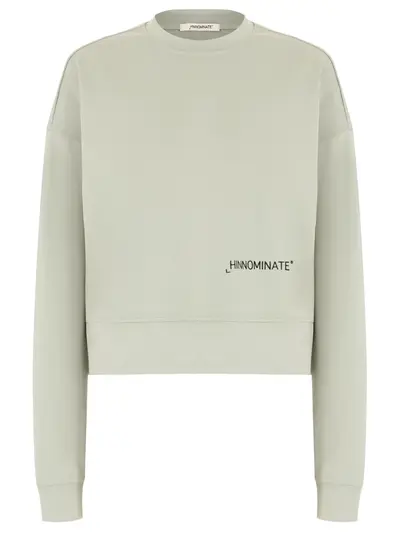 -Зеленая толстовка-оверсайз купажированного состава от HINNOMINATE. -Модель свободного кроя со спущенной линией плеча, удлиненными рукавами, эластичными манжетами и поясом, круглым вырезом горловины, контрастным логотипом бренда.