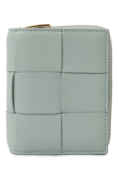 Портмоне нежного голубого оттенка выполнили вручную в фирменной технике intreccio из широких полос мягкой кожи. Материал тщательно выделали для придания особой пластичности и прочности, а затем отполировали до деликатного блеска. Внутри разместили шесть слотов для банковских карт, отделение для купюр и карман для монет.