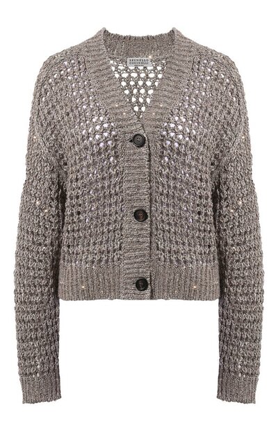 Мастера марки, основанной Брунелло Кучинелли, связали темно-серый кардиган с ажурным мотивом из мягкой пряжи, соединившей тонкий шелк и длинноволокнистый лен. Деликатный блеск добавленных в материал ламинированных нитей поддержали инкрустацией из глянцевых миниатюрных пайеток. Изделие органично дополнит непринужденный образ с брюками и мюлями.