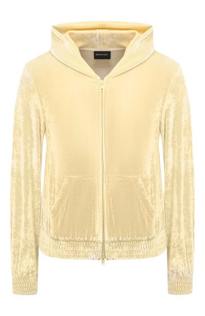 Толстовку канареечного оттенка сшили из легкого вискозного бархата, чья ворсистая фактура отражает свет, придавая изделию на молнии перламутровый блеск. Его поддержали мерцанием прозрачных кристаллов, которыми выложили логотип и эмблему сзади.