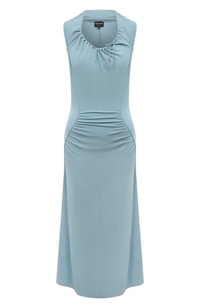 Два симметричных изогнутых шва на голубом миди-платье визуально сужают талию и формируют деликатную драпировку. Мелкие складки заложены и вдоль круглого выреза с кулиской и атласным шнуром, завязанным в небольшой бант. Дизайнеры итальянской марки, основанной Джорджо Армани, выбрали для пошива модели тонкое вискозное джерси с креповой фактурой, которое мягко облегает тело на лифе и эффектно струится на чуть расклешенном подоле.