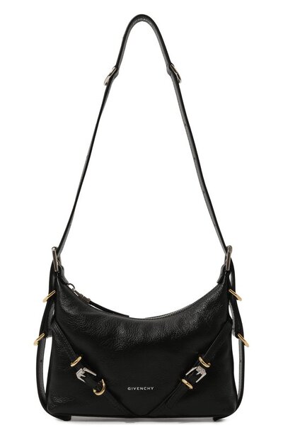 Черную сумку Voyou из зернистой телячьей кожи пересекают два узких ремешка из такого же мягкого материала. Симметричные элементы акцентированы золотистыми D-образными кольцами и серебристыми пряжками, которые гармонируют с металлизированным логотипом марки, основанной Юбером де Живанши. Такие же контрастные детали на ручке помогают отрегулировать ее длину и превратить в плечевой ремень. Внутрь поместятся портмоне, смартфон и футляр с очками.