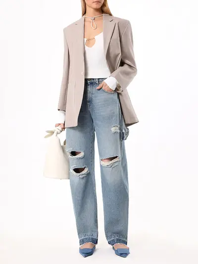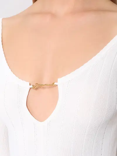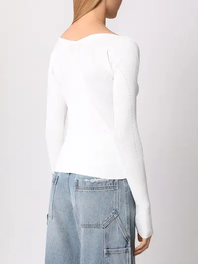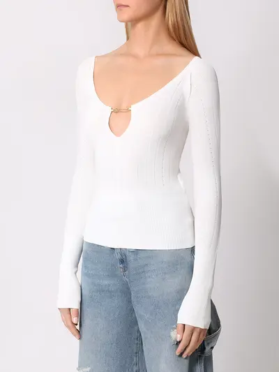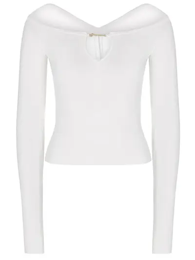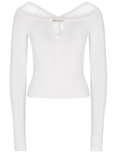 -Белый джемпер из тонкого вискозного трикотажа от JACQUEMUS. -Модель облегающего силуэта с длинными рукавами, рельефными манжетами и поясом, глубоким вырезом на груди с золотистой перемычкой в форме витого логотипа бренда.