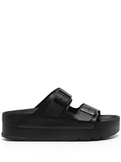 Birkenstock platform sandals designed in collaboration with Papillio and crafted in black smooth leather. Featuring a round-toe silhouette, adjustable buckled straps, leather lining, anatomically shaped cork-latex footbed and lightweight Eva rubber sole. The design is completed by the iconic Papillio logo embossed on side.
