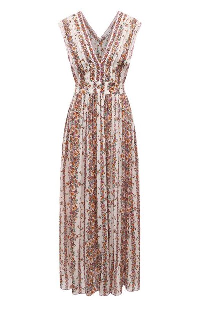 Для пошива разноцветного платья с растительным узором Lavender Waves Flowers, использовали тонкую вискозу. Ткань настолько легкая, что изделие практически не ощущается на теле. Материал изготовили из сырья, полученного в возобновляемых лесах. Модель с V-образным декольте и вырезом сзади украсили узкими складками.
