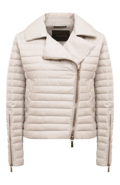 Крой кремового пуховика с отложным воротником и смещенной встречной молнией напоминает косуху. Изделие с акцентной металлической фурнитурой сшили из ультралегкого шелковистого нейлона, который надежно защищает от ветра. Воздушный наполнитель, распределенный по горизонтальным стеганым камерам, хорошо удерживает тепло, сохраняя комфорт при температуре от –5 до +12 градусов.