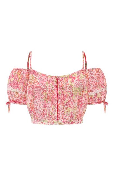 По-летнему яркий кроп-топ с мелким цветочным узором кажется надетым поверх похожего купальника. Такое впечатление создают узкие бретели, регулируемые слайдерами сзади. В круглом вырезе скрыли резинку, чтобы короткие рукава с завязками и кружевом можно было опустить и оставить плечи почти полностью открытыми. Эластичная лента дополняет и пояс сзади, поэтому модель из легкой вискозы не нуждается в застежке.