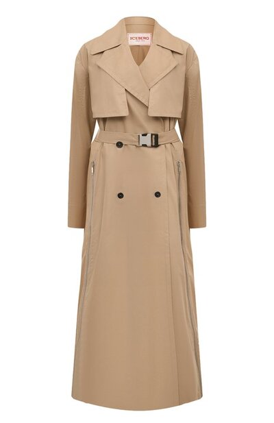 Для пошива двубортного тренча с отлетной кокеткой, декорированной сзади вышитым логотипом, использовали ткань из хлопка и полиэстера. Плащ с широкими лацканами и поясом с пряжкой-фастексом дополнили на расклешенном подоле длинными боковыми молниями, позволяющими сформировать разрезы.