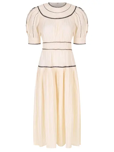 -Модель приталенного кроя с короткими рукавами, широкими манжетами, круглым вырезом горловины, застежкой на потайную молнию сзади и плиссированной юбкой, аккуратные складки которой эффектно выглядят в движении.