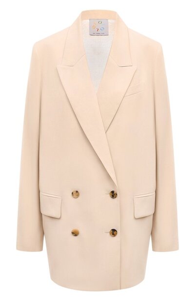 При создании светло-бежевого двубортного жакета позаботились не только о его лаконичном внешнем виде, но и о практичности. Для пошива изделия с заостренными лацканами выбрали мягкую плотную ткань из лиоцелла, которая почти не мнется. Чтобы слегка удлиненная модель еще лучше держала форму, у вещи предусмотрели подкладку из эластичного шелка.