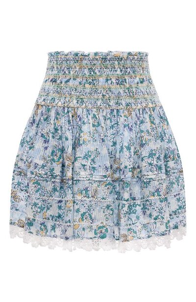 Короткую голубую юбку с цветочным принтом выполнили из тонкого нежного хлопка, настолько легкого, что изделие почти не ощущается на теле. Утрированно широкий пояс дополнили эластичной отделкой, отвечающей за удобную посадку по фигуре. Модель украсили ажурными полосами, сымитировав несколько ярусов, а края обрамили белым кружевом.