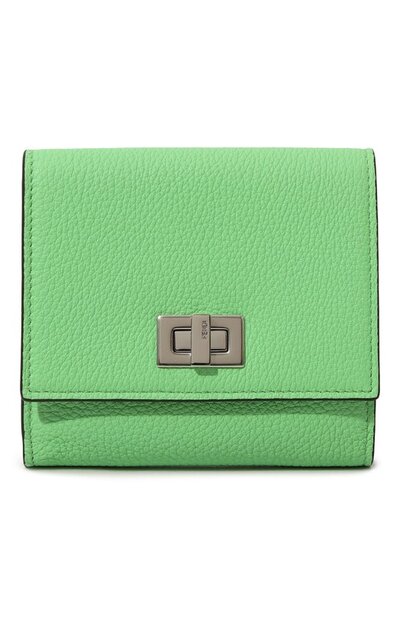 Для создания компактного салатового портмоне в три сложения использовали мягкую зернистую кожу Cuoio Romano с матовой поверхностью. Внутри аксессуара, застегивающегося кнопкой, предусмотрели десять слотов для пластиковых карт и два отделения для банкнот. В кармане с поворотным замком можно хранить монеты.