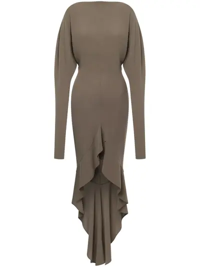earth brown crew neck long draped sleeves front slit ruffled trim asymmetric hem