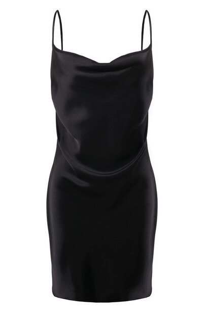 Черное платье-комбинация длины мини формирует крупные мягкие складки спереди и на вырезе. Тонкий атлас из ацетата и полиэстера отлично драпируется, поэтому силуэт выглядит особенно выразительно. Модель с узкими регулируемыми бретелями дополнили вытачками на спинке, которые очерчивают талию.
