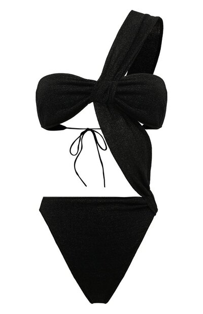 Черный слитный купальник напоминает комплект из асимметричного бра с открытым правым плечом и плавок с высокой посадкой, соединенных спереди широкой перемычкой. Для пошива модели использовали мягкий эластичный материал, который быстро сохнет. В состав добавили металлизированные нити, поэтому изделие сияет на солнце.
