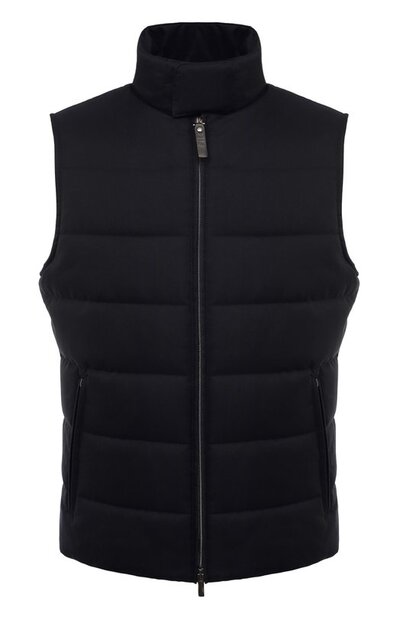 Темно-синий жилет выручит не только в прохладную погоду, но и в морозную, став промежуточным слоем с другой верхней одеждой. Для пошива изделия с боковыми карманами на молниях использовали матовый непродуваемый полиэстер. Утепленную стеганую модель дополнили высоким воротником.