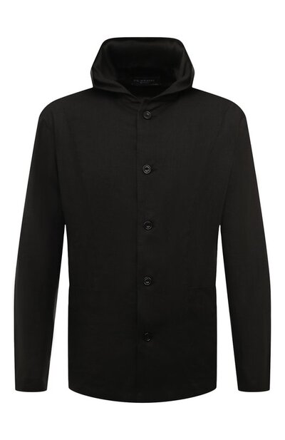 В исполнении дизайнеров неаполитанской марки черная рубашка свободного кроя напоминает рабочую куртку — модель дополнили вместительными карманами, капюшоном и крупными роговыми пуговицами. Сходство нарушает тончайший ирландский лен, который делает модель очень легкой и дышащей. Умягченная ткань меньше мнется и позволяет носить изделие не только поверх футболки, но и на голое тело.