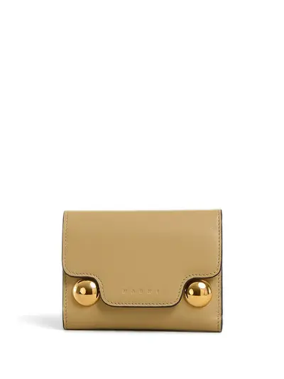 beige/gold calf leather brass trifold design debossed logo to the front snap button fastening internal card slots note compartment coin pocket