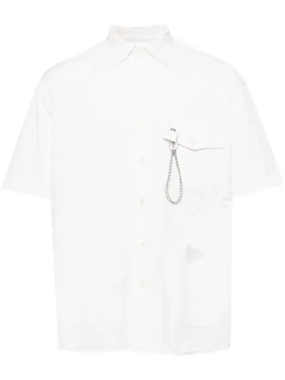 white cotton blend poplin texture appliqué detail logo-engraved silver-tone hardware spread collar front button fastening short sleeves chest flap pocket straight hem
