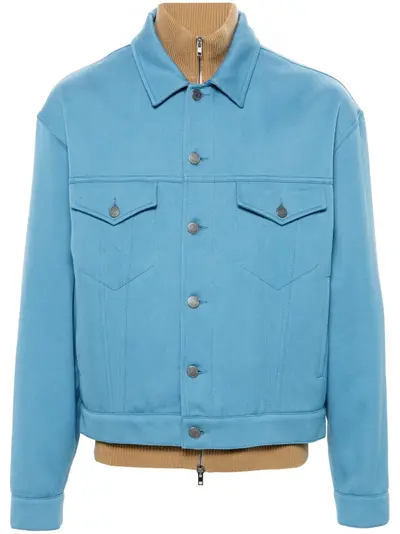cerulean blue/camel brown cotton blend twill weave layered design ribbed panelling high neck classic collar drop shoulder long sleeves with buttoned cuffs two chest button-fastening flap pockets two side welt pockets waist tabs ribbed hem front button fastening