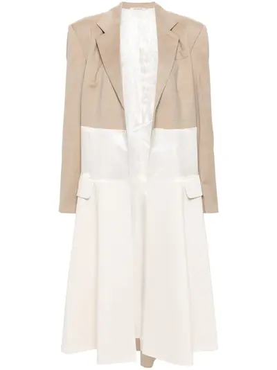 white/multicolour virgin wool panelled design canvas panelling canvas panelling dart detailing jacquard logo motif notched lapels open front shoulder pads long sleeves chest welt pocket two front flap pockets flared hem mid-length logo-jacquard lining