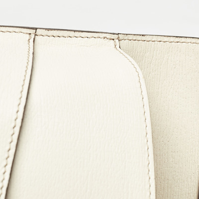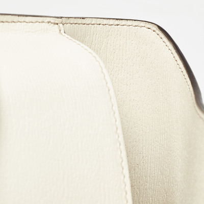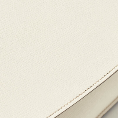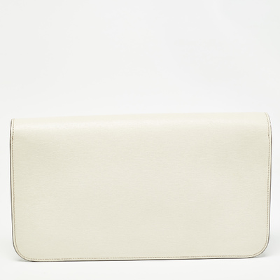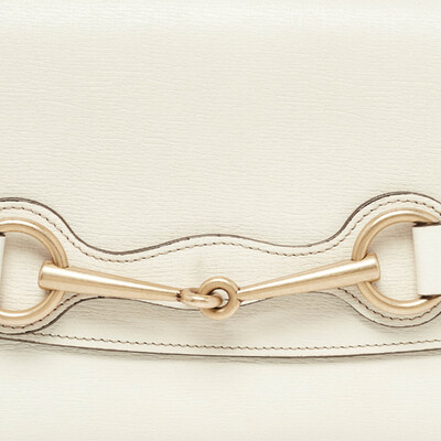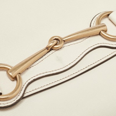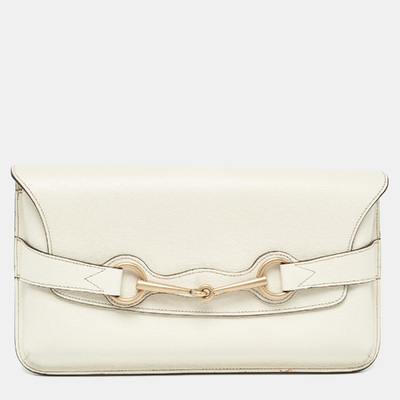Carry Guccis Bright Bit clutch against relaxed tailoring for a touch of nonchalance. It is crafted from off white leather with the brands signature Horsebit motif in gold tone hardware on the front flap. The flap opens to a canvas lined interior with enough space for essentials.