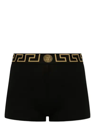 black/gold-tone stretch-cotton signature Greca-pattern print high-waisted elasticated logo waistband thigh-length Just a reminder that this piece must be tried on over your own garments.