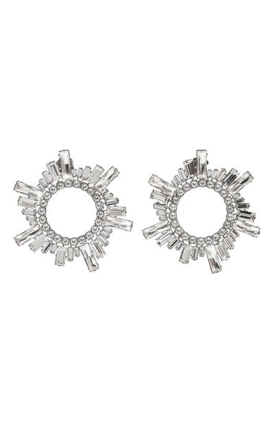 Геометричные линии придают крупным серьгам Begum сходство с украшениями в стиле ар-деко. Слегка асимметричный силуэт выстраивают белые кристаллы огранки «багет», выполненные в разных размерах. Внутри – безупречно ровное кольцо из круглых элементов. Основа аксессуара с застежкой-пусетой изготовлена из латуни с гальваническим серебряным покрытием.